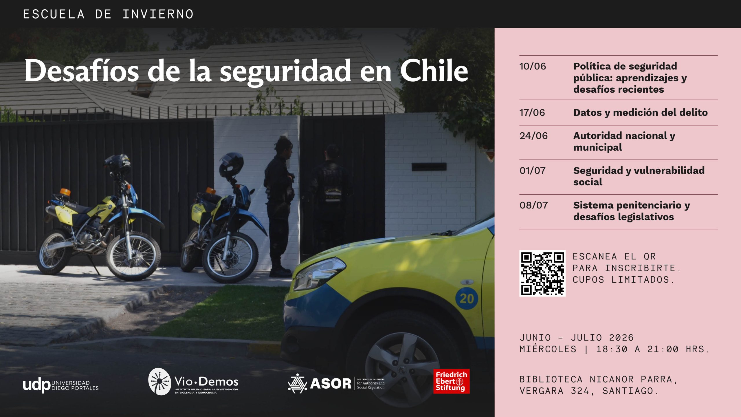 La Escuela de Invierno “Desafíos de la seguridad pública en Chile” es una iniciativa organizada por el Instituto de Investigación en Ciencias Sociales (ICSO) de la Universidad Diego Portales, junto a la Fundación Friedrich Ebert (FES), el Instituto Milenio ASOR y VioDemos,