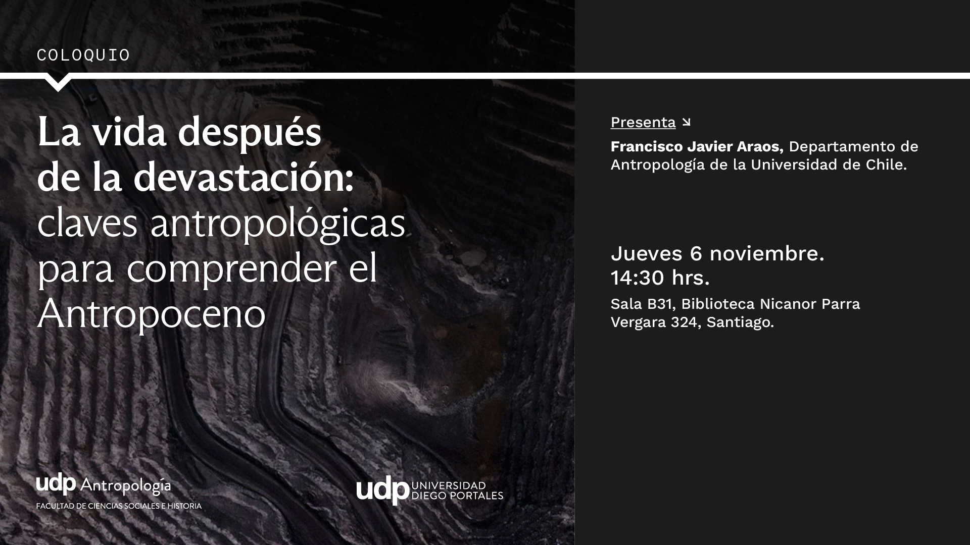 Sala B-31, Biblioteca Nicanor Parra UDP (Vergara 324, Santiago).