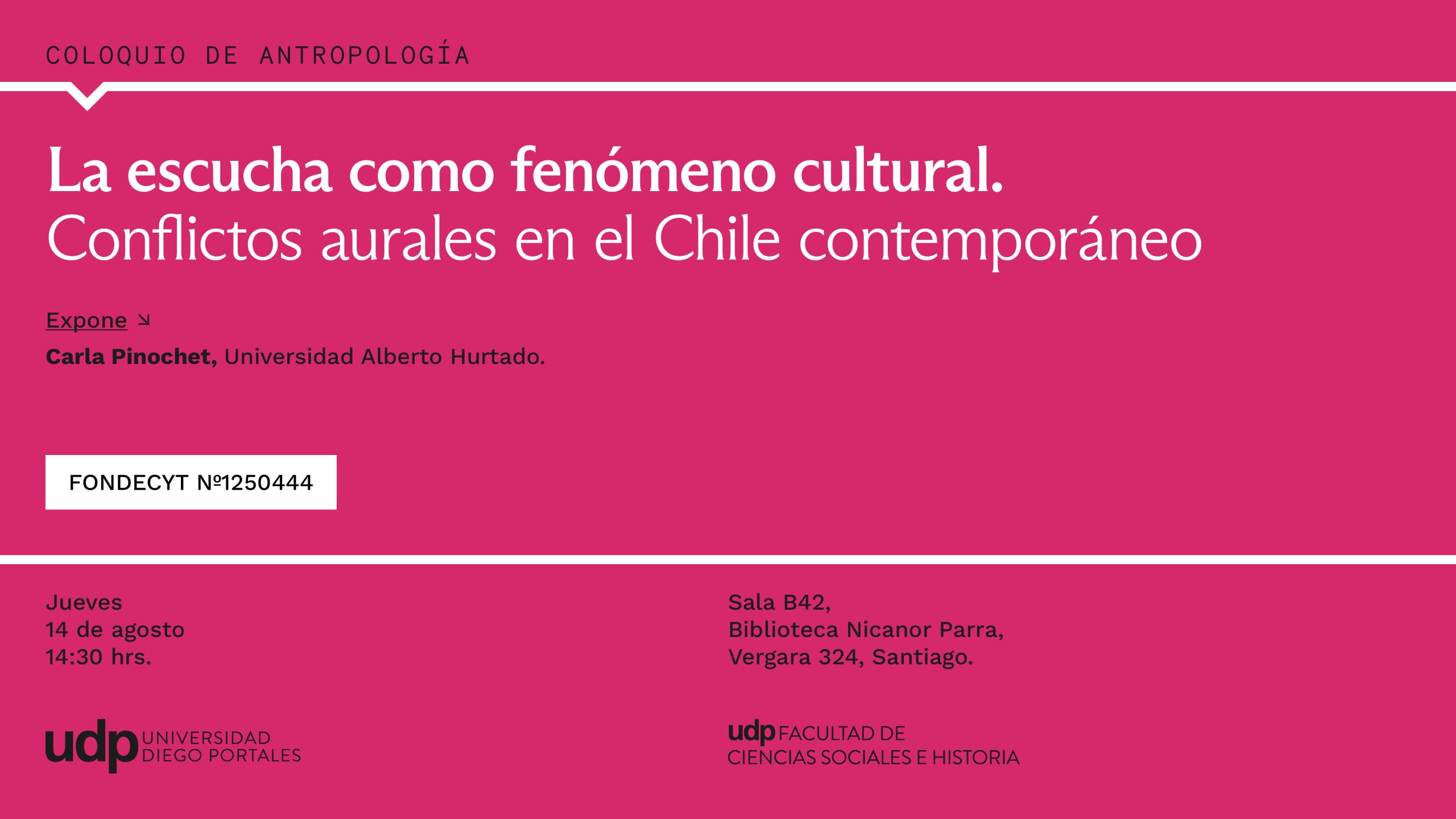 Sala B-42, Biblioteca Nicanor Parra UDP (Vergara 324, Santiago).
