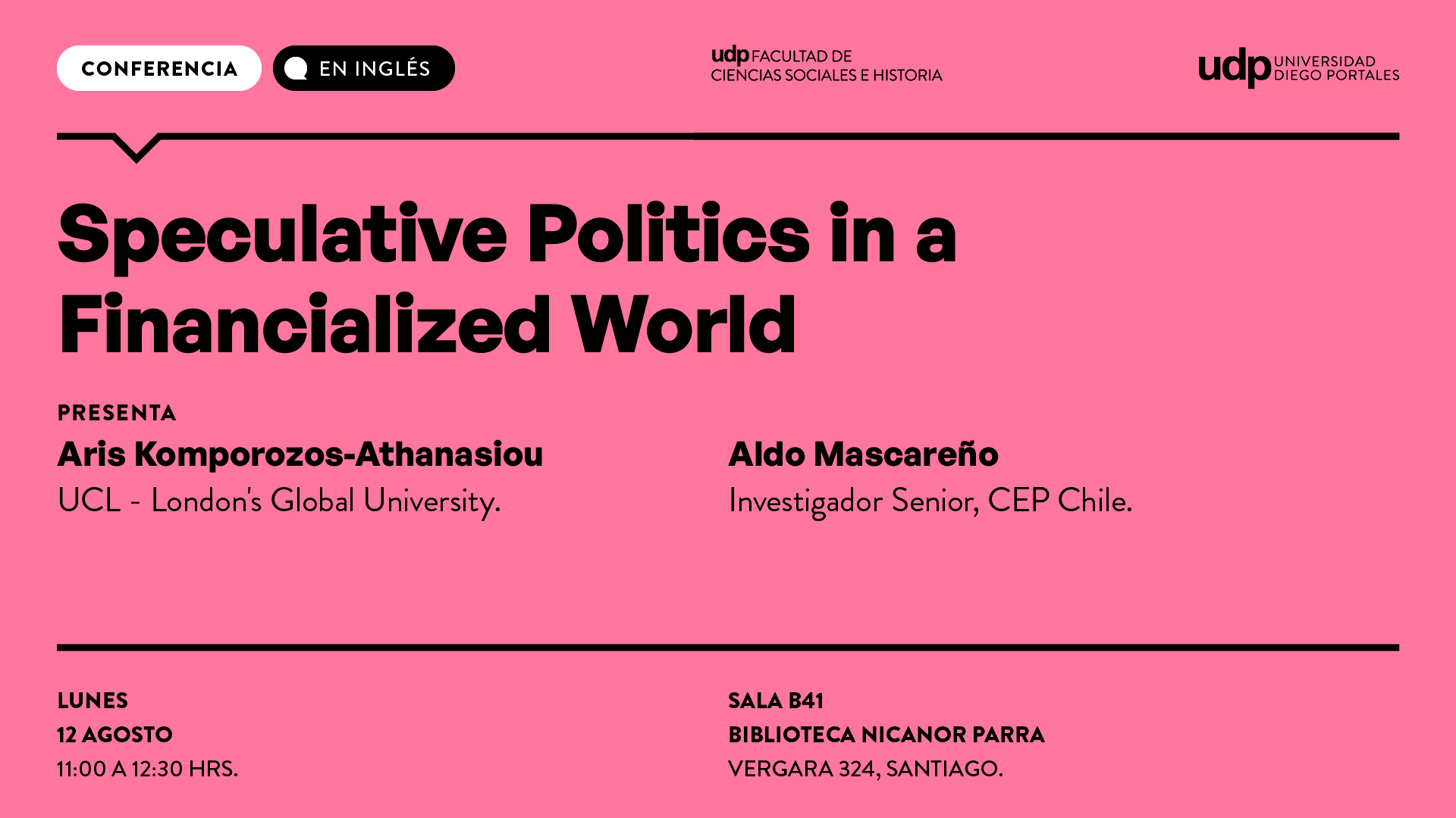 Sala B-41, Biblioteca Nicanor Parra UDP (Vergara 324, Santiago).